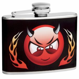 This compact little 4oz drinking flask is a great flask for little trouble makers. The 4oz flask holds about 4 one ounce shots of your favorite liquor and is small enough to fit in most purses and pockets. The design is set against a black background and features a circle-head red devil with horns and...