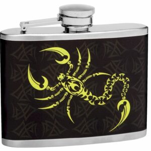 This is a compact 4oz stainless steel hip flask. The flask features a black background with a faded tribal pattern in the back. The scorpion is front and center and is done in yellow and made up of of it's own tribal design. This is a unique hip flask that no one in your circle...